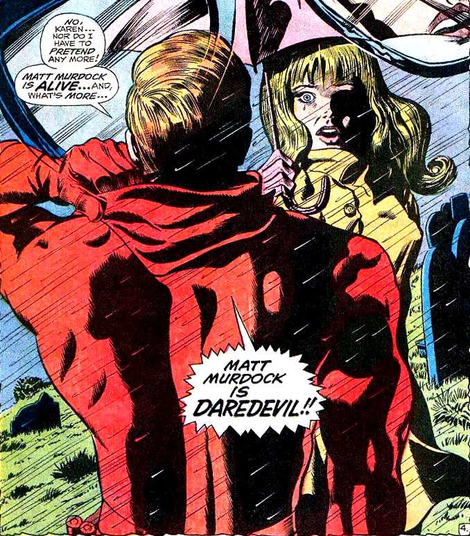Karen Page était la secrétaire de Matt Murdock alias Daredevil. Elle a longtemps été la petite amie du héros, au point que Matt lui révèle son identité secrète. Elle connait une véritable descente aux enfers à cause de la drogue. Mais elle finit par revenir dans la vie de Matt. En 1999, Elle connait une fin tragique dans Daredevil (vol. 2) 5, assassinée par Bullseye, un supervilain déjà coupable de la mort d’Elektra, un des 1ers amours de Matt. Depuis, Karen Page n’est plus jamais réapparue.