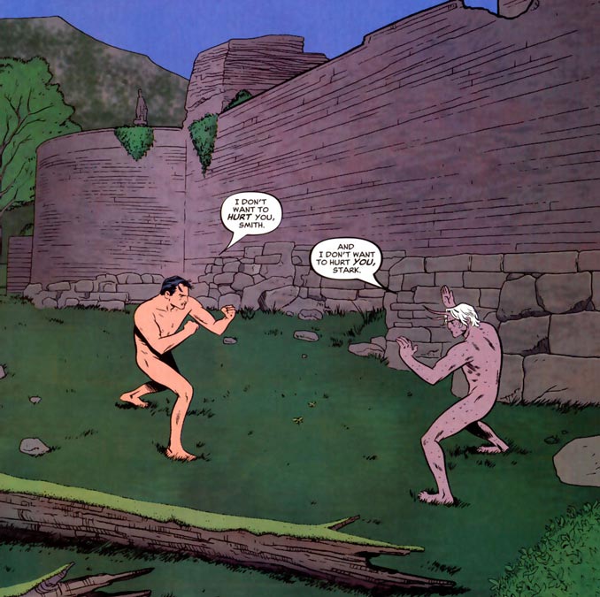 En plein combat, les deux atterrissent au beau milieu de l’Église de la Vérité Nue, une secte qui n’a rien contre la bagarre, tant qu’elle respecte une règle simple : tout le monde à poil. Pour ne pas froisser les coutumes locales, nos deux super-héros s’exécutent et poursuivent leur duel dans le plus simple appareil. Fini les lasers et les armures high-tech, place aux pichenettes et aux points de pression façon kung-fu naturiste. Résultat : un affrontement aussi absurde qu’hilarant, sans véritable vainqueur… si ce n’est le lecteur, mort de rire devant la scène.