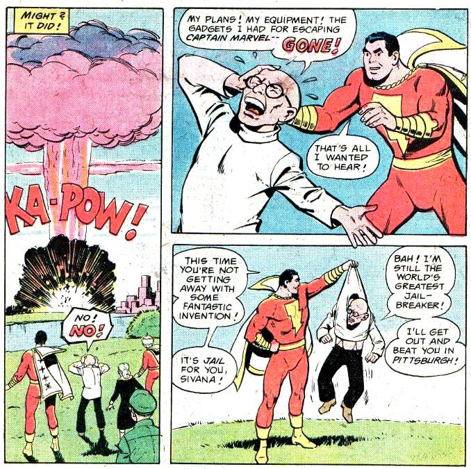 Pour autant, et malgré ces imitations, le Captain Marvel d’origine n’a pas été oublié. Et dans les années 70, National devenu entretemps DC Comics, racheta le catalogue de Fawcett. Ce qui permet à DC de lancer en 1972 la série Shazam ! L’éditeur décide alors de faire appel à son cher concept de multivers pour intégrer Shazam à son catalogue sans avoir à le dénaturer. Les lecteurs apprennent donc que la Marvel Family vit en réalité sur la Terre-S. Un monde où l’on vit des aventures au ton plus léger que sur Terre-1. Et pour justifier l’absence de ces personnages pendant une vingtaine d’années, les scénaristes imaginent qu’un piège du Docteur Sivana, le grand adversaire de Captain Marvel, a mal tourné et emprisonné héros comme vilains dans un temps suspendu. Mais les voilà de retour, et le succès avec, si bien qu’ils connaissent les honneurs d’une nouvelle adaptation en 1974 cette fois pour la télévision. Ce qui permet au personnage de se faire connaitre auprès d’un public bien plus large que celui des lecteurs de DC.