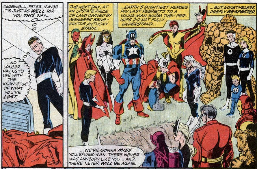 Dans cette sombre réalité, le son des cloches ne suffit pas à séparer Peter Parker du symbiote Venom. Au contraire, Venom prit complètement possession de lui, manipulant le héros comme une vulgaire marionnette au service de ses ambitions dévorantes. Au bout du compte, Venom avait tellement puisé dans les forces de son hôte que Peter se retrouva complètement épuisé, vieilli prématurément, quasiment méconnaissable. Privé de son énergie vitale, il mourut simplement de vieillesse, usé jusqu’à la corde par le parasite extraterrestre. Aussi étrange que cela puisse paraître, cette mort tranquille et sans violence apparente reste sans doute l’une des fins les plus douces jamais offertes à un Spider-Man.