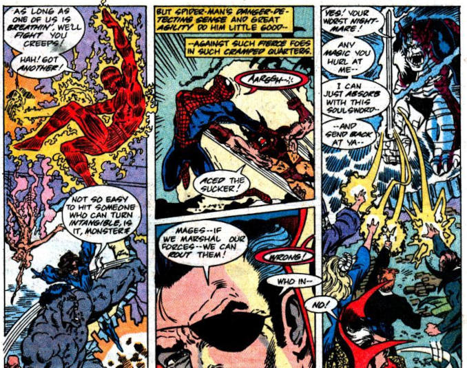 Dans cette réinterprétation sombre et cruelle de l’arc culte des X-Men, Inferno, signée Danny Fingeroth, les héros mutants furent complètement anéantis par les hordes démoniaques du Limbo menées par Madelyne Pryor, alias la Reine Démon. Pourtant, la menace la plus directe ne venait pas de Madelyne elle-même, mais d’un Wolverine possédé par un démon. En proie à une folie meurtrière, Wolverine massacra ses propres alliés, plusieurs membres des Avengers, et Spider-Man lui-même. Le héros reçut un coup mortel des griffes en adamantium directement dans le dos, une attaque si imprévisible que même son fameux sens d’araignée ne put l’en protéger. [CLIQUEZ SUR LA PAGE SUIVANTE]