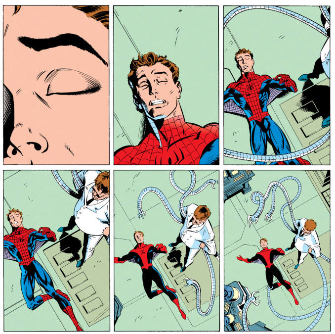 En 1994, l’arc Web of Death se baladait entre deux séries : The Amazing Spider-Man et The Spectacular Spider-Man. Quatre chapitres, quatre numéros, et un Peter Parker en sale état. La faute au Vautour, ce bon vieux Adrian Toomes, qui l’empoisonne avec un produit sans antidote connu. Le genre de poison qui ne vous offre pas de baroud d’honneur. Dans les deux premiers chapitres, on assiste à une lente descente aux enfers : Peter vacille, perd ses moyens, s’affaiblit à vue d’œil. Ça pue la fin.