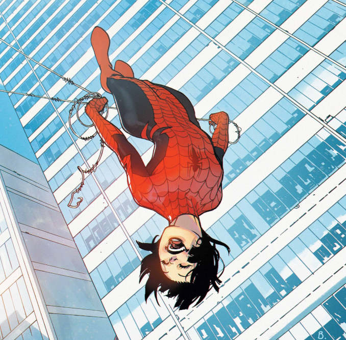 C’est un artiste français, Bengal, qui s’occupe du personnage de Silk pour la variant cover du numéro 4 de la série du même nom. Cindy Moon est une des nombreuses « Spider-Women » de l’univers Marvel. Silk a pour particularité d’avoir été mordue par la même araignée qui a donné ses superpouvoirs à Spider-Man. Retour aux origines qui sert de thématique à cette couverture puisque Silk y arbore le costume traditionnel de Spider-Man !
