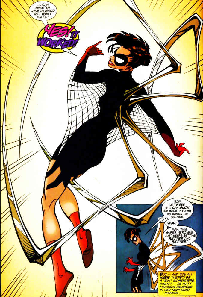 Mattie Franklin apparaît tout d’abord comme une admiratrice de Spider-Man. Elle obtient des pouvoirs au cours d’un rituel occulte organisé par Norman Osborn. Mattie Franklin décide alors de marcher dans les pas de son idole, Spider-Man, ce qui tombe bien puisqu’à cette période Peter Parker choisit de prendre du repos. La fin de carrière de cette Spider-Woman est tragique : elle est sauvagement sacrifiée dans un rituel magique lié à Kraven.
