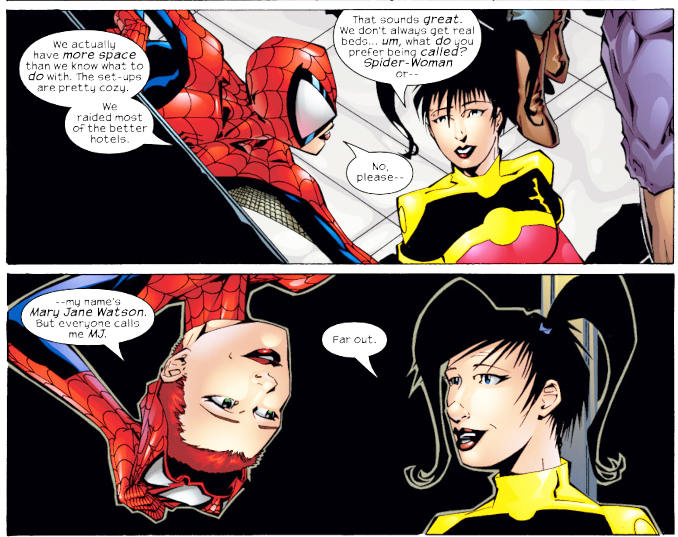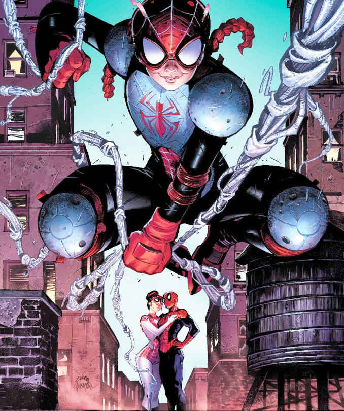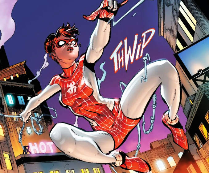 Dans le multivers Marvel, il existe la Terre-18119 où Peter Parker et Mary Jane sont toujours en couple ; et ont même une petite fille. Dans la saga Renouveler ses vœux, c’est toute la petite famille Parker, soir papa, maman et leur fille, qui ont des superpouvoirs et des costumes de l’Araignée. Mary Jane Watson devient Spinneret. En réalité, Mary Jane n’a pas à proprement parler de superpouvoirs : les capacités extraordinaires de Spinneret proviennent de sa combinaison qui draine et recopie les superpouvoirs de son mari, Peter Parker. Si vous avez envie d’en savoir plus, consultez notre article sur Renouveler ses voeux.