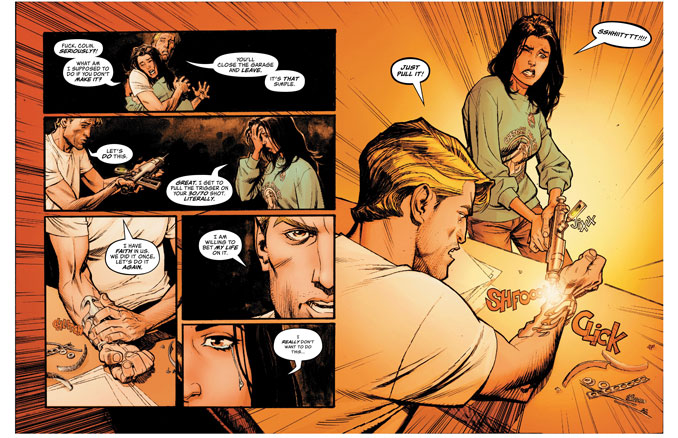 Malheureusement, cette belle dynamique s’effrite lorsque le scénario commence à dévoiler ses cartes. En réalité, Stand Still glisse alors vers quelque chose de beaucoup plus classique. Le thriller tendu et étrange devient peu à peu un récit de trauma, de vengeance et de rédemption bien plus attendu. Ce n’est pas illisible, loin de là. Cependant, on sent que Loughridge, excellent coloriste mais scénariste débutant, n’arrive pas toujours à canaliser ses idées. Certaines bifurcations paraissent abruptes. Certains enjeux changent de nature sans vraie transition solide. Au final, le récit ne s’écroule pas complètement, mais il perd cette singularité qui faisait tout son sel au départ.