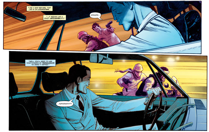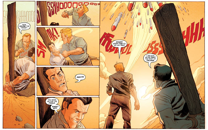 Le point fort le plus évident de Stand Still, c’est sa promesse de départ. Ryker Ruel a mis la main sur une machine capable de figer le temps, et il s’en sert comme le pire individu possible s’en servirait. De fait, Lee Loughridge pose d’emblée une mécanique efficace. On comprend vite l’intérêt dramatique du dispositif, car ce pouvoir transforme chaque scène en terrain de jeu malsain. Dès les premières pages, le récit impose une tension particulière. Le temps arrêté permet à Ryker de devenir une sorte de prédateur absolu, presque invincible, ce qui donne à ses apparitions un parfum de catastrophe imminente.