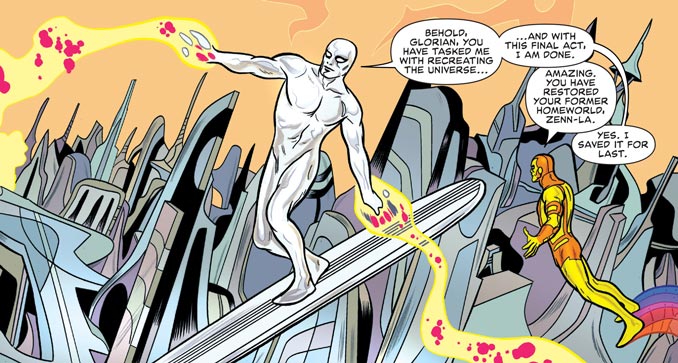L’ultime épisode de la septième série de Silver Surfer, signé Dan Slott, mise moins sur la baston pure et plus sur l’aventure et les relations. Résultat : un personnage qui gagne en profondeur, notamment à travers son lien avec Dawn. Ensemble, ils traversent l’univers main dans la main, découvrant mondes et merveilles.