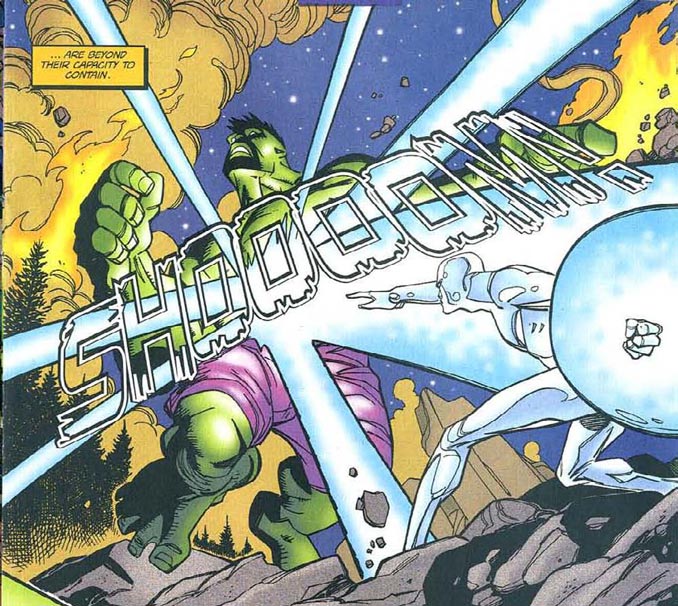 Le combat qui s’ensuit est un festival de puissance brute. Même face au Pouvoir Cosmique, Hulk encaisse et rend coup pour coup. Le Surfeur aurait pu l’abattre, mais choisit une autre voie : tenter de ramener Banner à la surface. Échec total. La victoire est là, mais elle a un goût amer, car elle laisse derrière elle un Hulk toujours prisonnier de sa colère… et un Surfeur impuissant face à la tragédie de son ami.