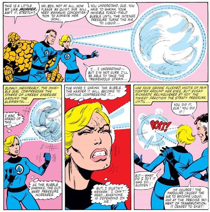 Fini la simple invisibilité plan-plan. Sous la plume de Byrne, Sue déploie des champs de force offensifs, manipule la matière autour d’elle, immobilise ses adversaires, et contrôle l’espace avec une précision chirurgicale. En gros, elle devient potentiellement la plus puissante des 4. Et tout ça sans renier son rôle de mère et de leader. Comme quoi, parfois, il suffit d’un scénariste qui y croit pour faire passer une potiche de second plan en MVP de l’équipe.