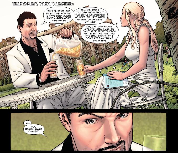 Durant Civil War, Tony Stark rend visite à Emma Frost afin de connaître la position des X-Men. Durant leur échange, il est clair que les 2 personnages évoquent une relation intime passée !