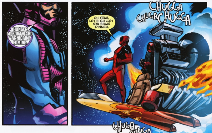 Dans cette histoire, Deadpool proposa des planètes plus ridicules les unes que les autres à Galactus : peuplées de créatures inspirées des Pokémon ou encore d’Ewoks. Finalement, son comportement exaspéra tellement le Dévoreur qu’il finit par congédier son héraut improbable. La conclusion est typique de Deadpool : il participe à une réunion des « anciens hérauts de Galactus Anonymes », cherchant à faire le point sur sa vie. Une parenthèse hilarante, mais loin de faire de lui un héraut mémorable.
