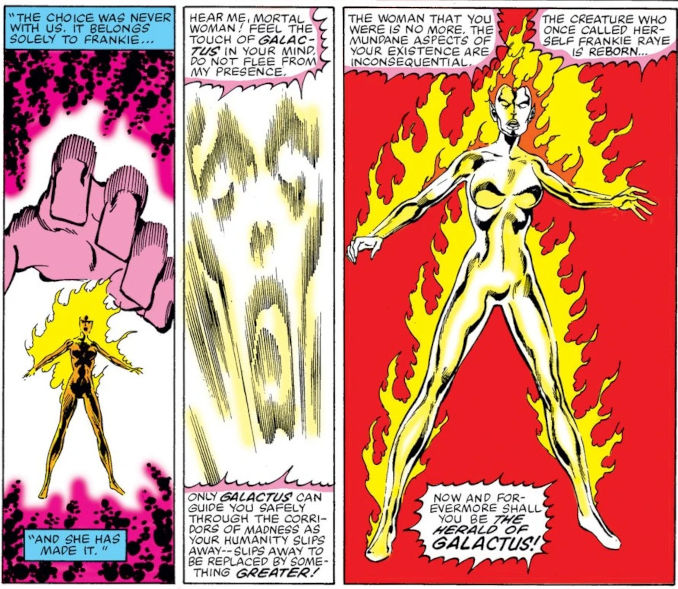 Cependant, ce rôle ne fut pas sans conflit. Alors qu’elle guidait Galactus vers des mondes à dévorer, Frankie fut confrontée à la réalité brutale de ses actes : des milliards de vies sacrifiées pour nourrir son maître. Ces dilemmes moraux la rongèrent progressivement, jusqu’à ce qu’elle finisse par perdre sa place en raison de sa compassion. Bien que son passage en tant que héraut ait été marqué par des moments de bravoure, il illustre également le coût émotionnel de servir un être comme Galactus.