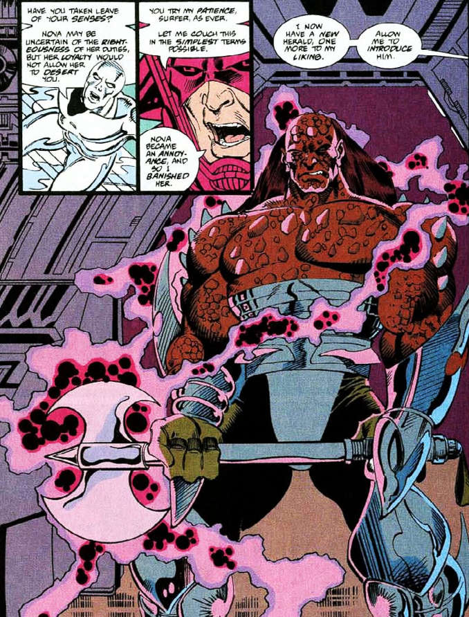 Lorsque Nova quitta son rôle de héraut, Galactus choisit Morg pour la remplacer. Mais contrairement à son prédécesseur, Morg était bien plus brutal et impitoyable. Avant de devenir héraut, il avait déjà commis un génocide sur sa propre planète, et sa cruauté s’accentua après avoir reçu le Pouvoir Cosmique.