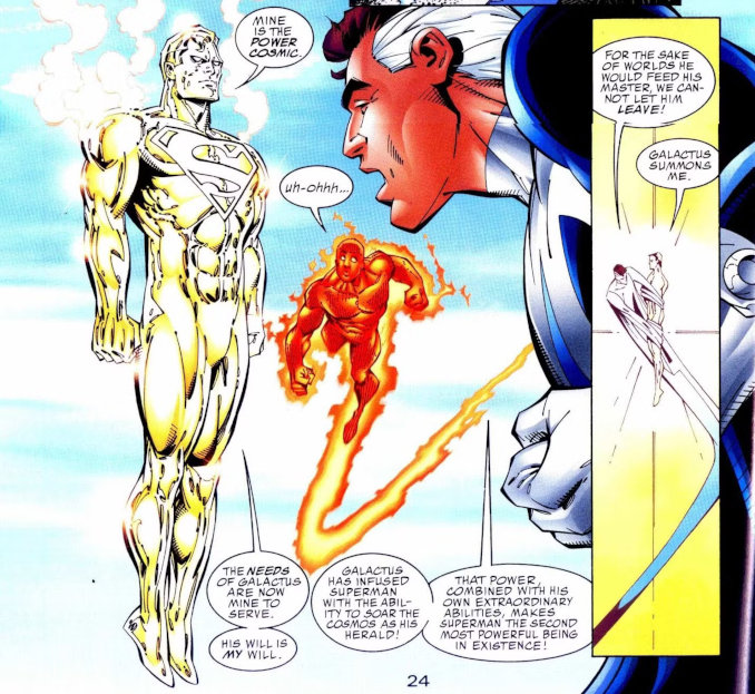 Dans un crossover entre Marvel et DC, Superman fut manipulé par Cyborg Superman, qui lui fit croire que Galactus avait détruit Krypton. Transporté dans l’univers Marvel, Superman devint temporairement un héraut de Galactus.