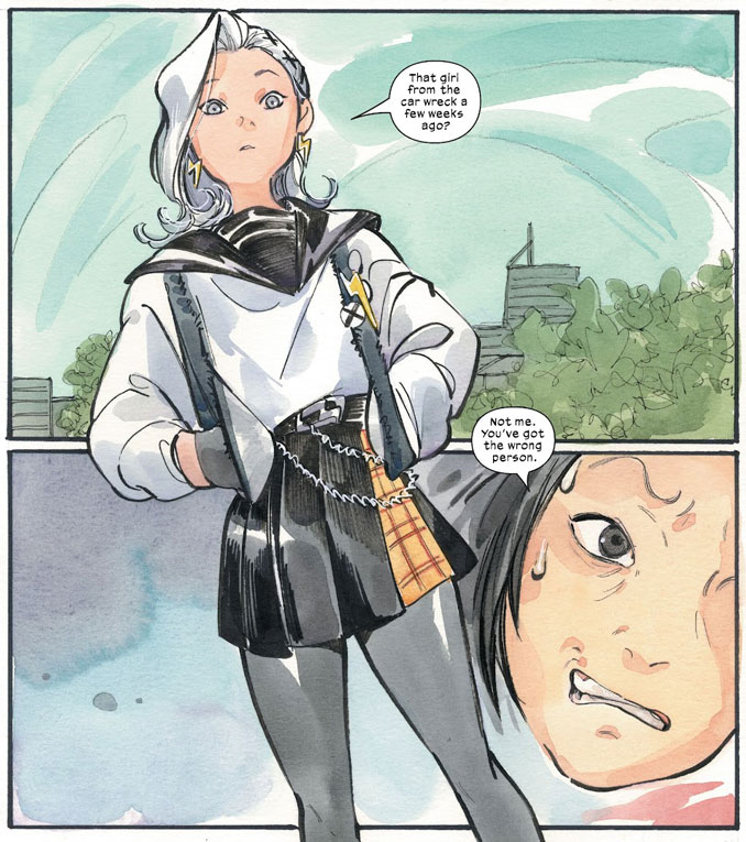 Ce qui frappe immédiatement à la lecture de Ultimate X-Men, c’est la sensation d’étrangeté. Peach Momoko, autrice et dessinatrice principale, signe ici un projet profondément différent de ce que l’on attend habituellement d’un titre X-Men. L’action se déroule au Japon, dans un cadre scolaire, loin des bases secrètes et des affrontements super-héroïques spectaculaires. Le récit adopte un rythme lent, presque contemplatif, centré sur le quotidien, les silences et les traumatismes de ses personnages. Cette approche tranche nettement avec les autres séries de l’Ultimate Universe, plus démonstratives, et donne à cette série une identité immédiatement reconnaissable.