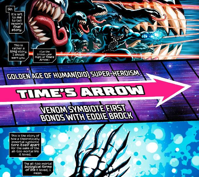 Le symbiote réutilise plusieurs autres ADN dans sa guerre contre les Super Intelligences Artificielles, qui refusent de voir que leurs quêtes tuent la vie biologique. Venom se donne le pouvoir de détruire des planètes, mais ça l’affaiblit. Il utilise l’ADN de Vif-Argent pour penser et agir aussi vite que les ordinateurs, mais cela tue ses hôtes. Venom récupère l’ADN de voyageurs temporels comme Tempus, et file dans le Temps pour obtenir de nouveaux pouvoirs, contenir en lui la trace de toutes les vies biologiques. Mais les Super Intelligences Artificielles ont vaincu et absorbé les Célestes ; la défaite est inévitable. Venom demeure alors la seule forme de vie biologique, et son hôte meurt. Le symbiote comprend qu’il a dans sa mémoire tout l’ADN de toute la Vie elle-même… et il agit, alors. Venom utilise ses pouvoirs pour créer un univers de poche, pour injecter tout l’ADN collecté. Il recréé entièrement la Vie, et meurt avec ce cadeau. Les Super Intelligences Artificielles ne s’en préoccupent pas, toujours concentrées dans leur quête cosmique. Mais elles admettent avoir de l’estime pour un tel acte, une telle réussite pour le symbiote.