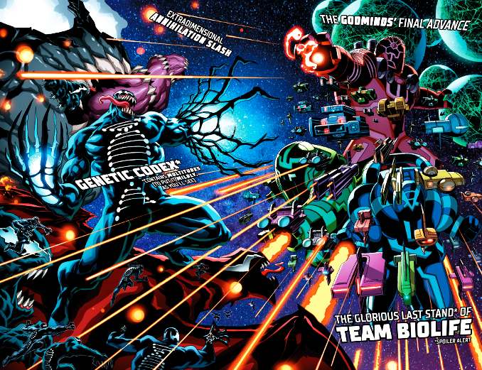 Les Super Intelligences Artificielles s’affrontent dans l’espace, anéantissant peu à peu toute forme de vie biologique. On voit ainsi les Phalanx face à Starkware, une Super Intelligence Artificielle basée sur l’esprit de Tony Stark ; elles finissent par s’unir, pour chercher les réponses aux mystères de l’univers. Venom prend conscience que tout cela va anéantir les formes de vie avec qui il aime tant se lier, et il veut agir. Hélas, les autres symbiotes refusent de s’unir, et Venom en vient à les éradiquer. On apprend qu’il a en mémoire l’ADN, la mémoire et les pouvoirs de ceux avec qui il s’est uni, même temporairement. Le symbiote reprend l’ADN de Jamie Madrox, pour se reproduire. Il réutilise l’ADN du mutant Elixir pour manipuler la biologie, et créer de la diversité dans ces nouvelles générations. Venom se construit des planètes entières pour former sa propre armée, à qui il donne des bouts de symbiote. Un Venomverse encore plus grand, donc.
