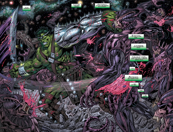 On peut lire World War Hulk sans avoir lu Planète Hulk qui, après une publication en poche il y a quelques mois, vient justement de ressortir en omnibus, . Le récit donne assez d’éléments pour comprendre l’essentiel. Malgré tout, il ne faut pas raconter d’histoires au lecteur. L’impact émotionnel n’est pas le même si l’on débarque ici sans bagage. Toute la rage de Hulk vient de ce qu’il a vécu auparavant. Son exil, son ascension sur Sakaar, son attachement à ce monde, puis son drame intime donnent à cette guerre une profondeur qu’on ressent mieux après lecture de Planète Hulk. Sans cet arrière-plan, certains lecteurs risquent de voir surtout un gros bonhomme vert casser des mâchoires avec application. Avec lui, on comprend davantage pourquoi cette colère déborde de partout. Autrement dit, World War Hulk se suffit à lui-même sur le plan narratif, mais il gagne beaucoup en intensité lorsqu’on connaît la tragédie qui le précède.
